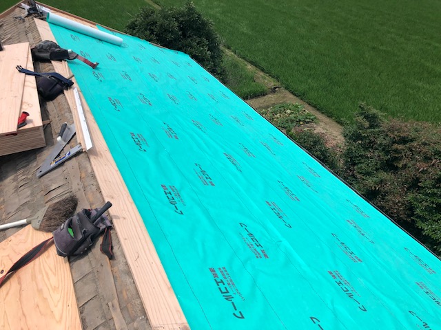 梅雨時期のではありますが見事な晴天日に屋根の葺き替え工事を着工させていただきました。