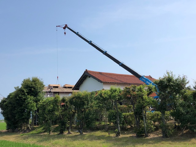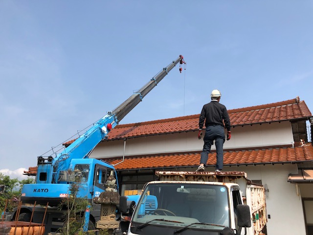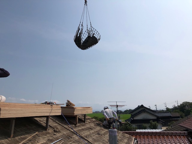という事で母屋を飛ばして既存瓦の撤去並びに新規瓦の荷揚げを行わせていただきました