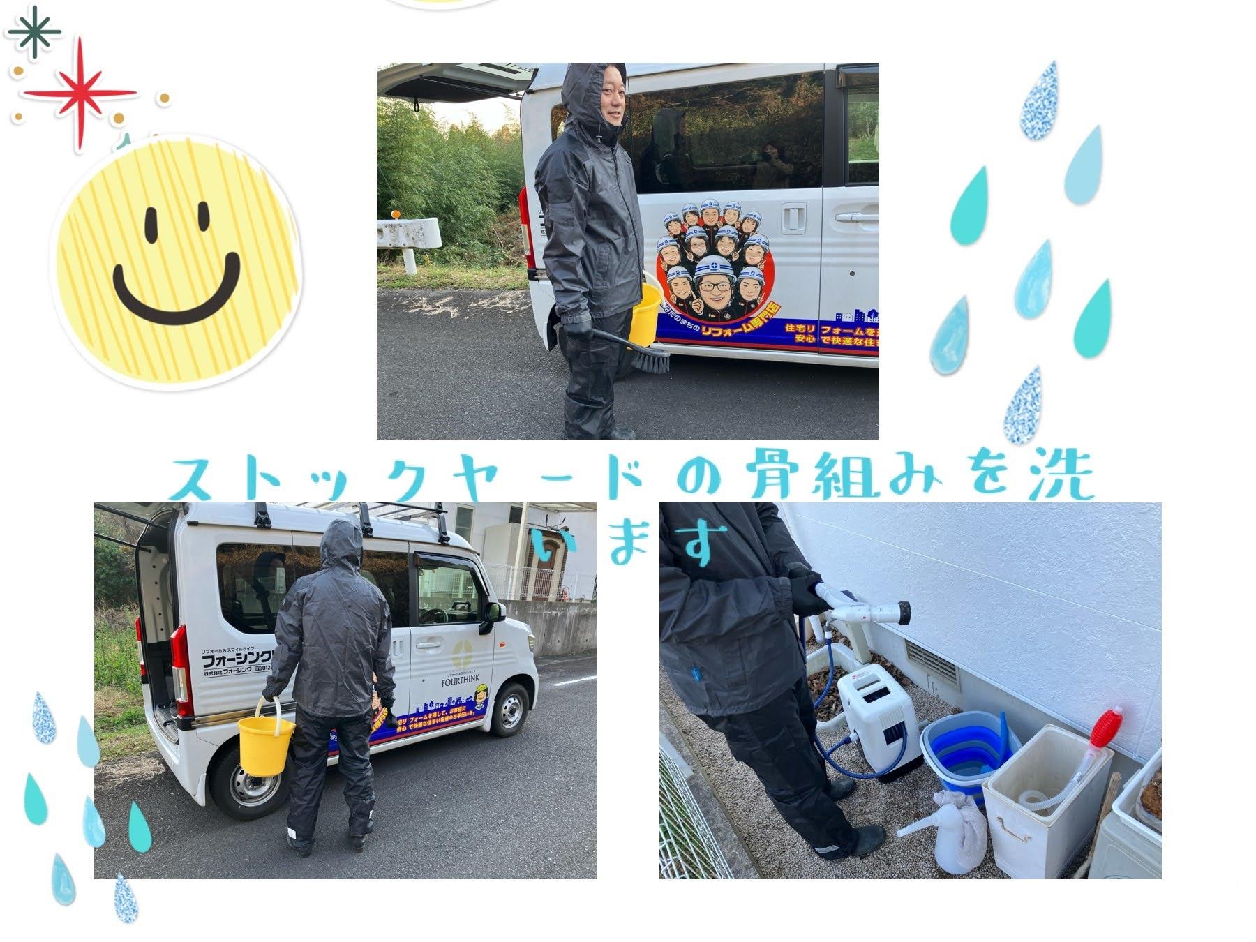 ストックヤードの骨組みを綺麗にすべくブラシとバケツとカッパを着込んで出動しております!