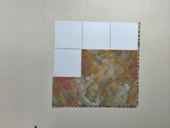 まずはマスキングテープでここに張るぞ!と決めて、下地のスチールシートを壁にタッカー打ち付けていきます。そのあとはエコカラットの裏面に磁石が貼ってありますので、番号順に貼り重ねていけば完成です!