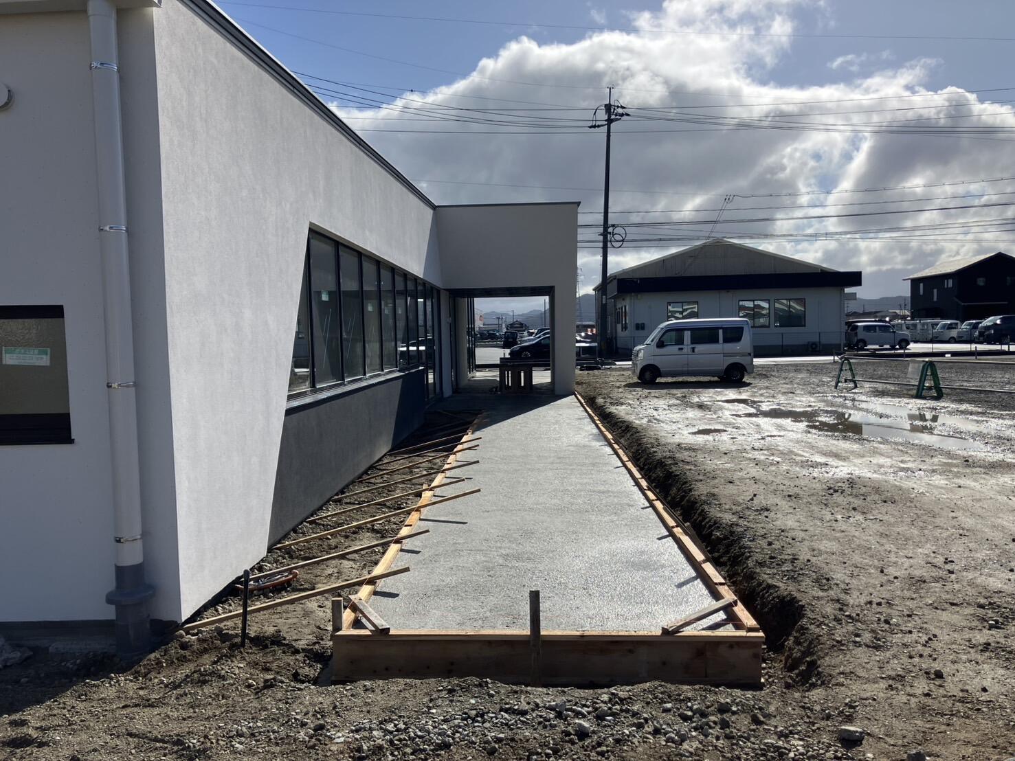 フォーシンク新社屋建設はテラス・ポーチの外構工事が進んでいます!ショールーム正面には大きなガラス面と広いテラス空間があり、完成後は来場されるお客様がゆったりと出入りできる開放的なポーチになります( *´艸`)